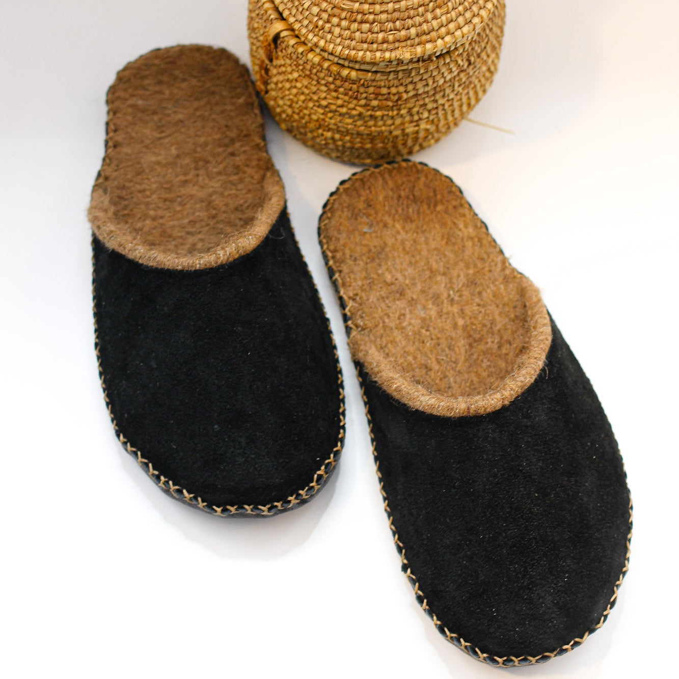 Handmade out of all natural sheep wool locally sourced from Fuwa, Khafr Elsheikh, naturally dyed with cowhide leather in suede offwhite and camel leather in suede black. Only available for a limited time. For indoors and outdoors use, you may request an anti-slip rubber stick at no extra cost. For size guide: Small (36,37,38) Medium (39,40,41) Large (41,42,43) XLarge (44,45,46).